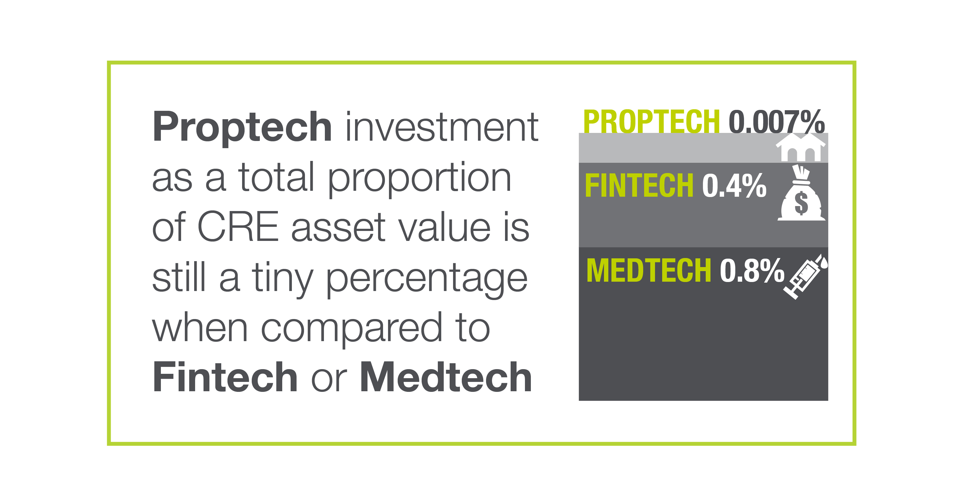 - Proptech investment as a total proportion of CRE asset value is still a tiny proportion when compared to Fintech or Medtech. Our sector needs to close the investment if it hopes to make the quantum leaps since in other sectors over the past decade.