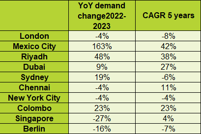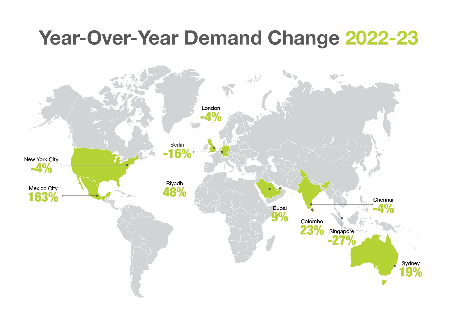 As illustrated in the chart, only five of the 10 hottest markets saw demand increase between 2022-23 — Mexico City (+163%), Riyadh (+48%), Colombo (+23%), Sydney (+19%), and Dubai (+9%).
