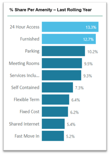 Historically, “furnished” has been the most-searched-for amenity, accounting for 21% of all searches over the past five years. However, as the traditional nine-to-five work structure becomes more fluid, “24-hour access” has claimed the top position.