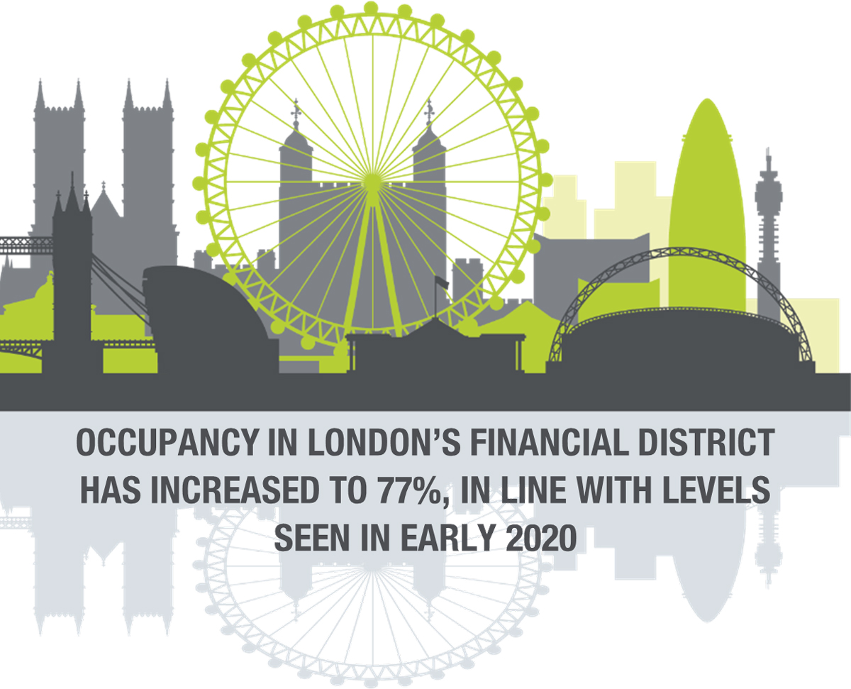 - Although footfall occupancy is still below pre-pandemic levels, contractual occupancy in highly sought-after spaces and locations has recovered above pre-pandemic levels, a sign that companies are confident that their workforce will return to the office, at least for part of the time.