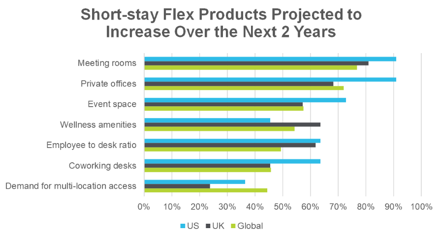 Our latest data reveals a surge in short-stay flex product demand, with 81% of operators predicting a significant rise in meeting room usage.