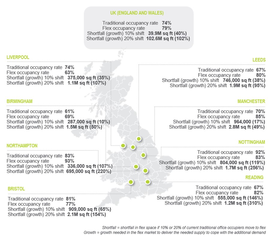 Across England and Wales, around 626 million square foot of traditional office space is currently leased, and if we saw just a 10% shift of occupiers towards flex space, this would create a shortfall in flex supply of around 39.9m square feet.