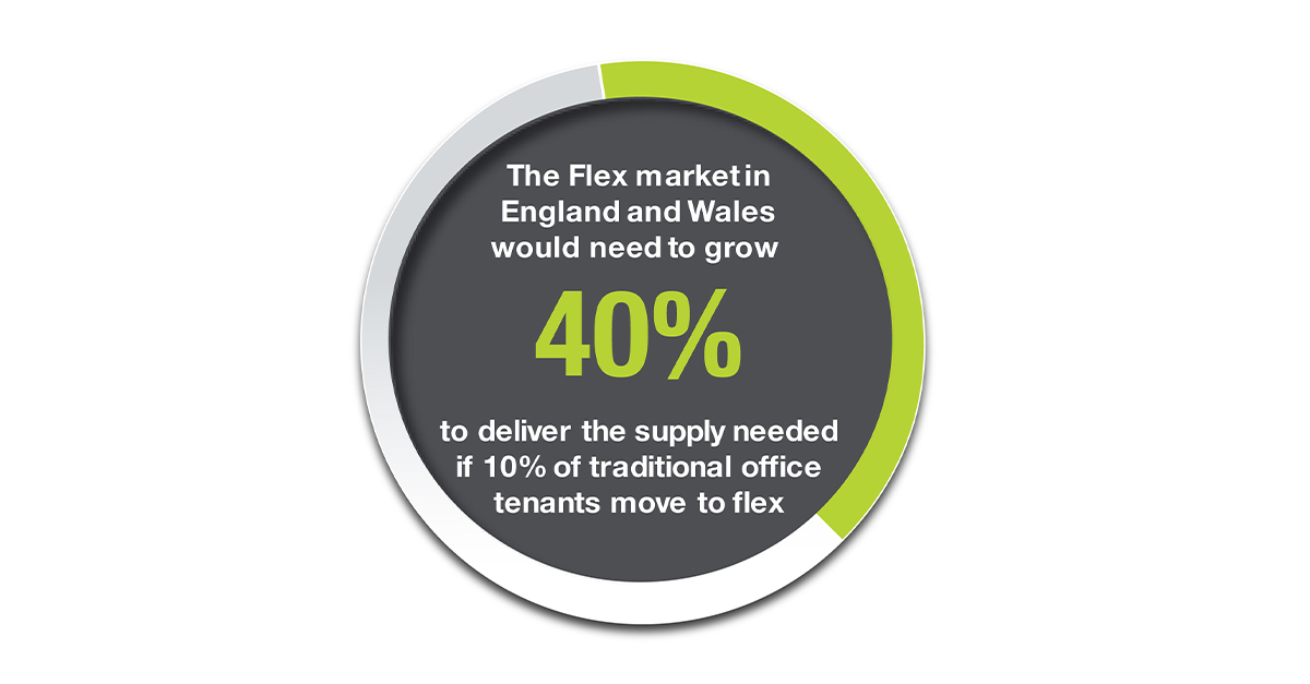 - The Flex market in England and Wales would need to grow by 40% to deliver the needed supply if just 10% of leased office tenants moved to flex