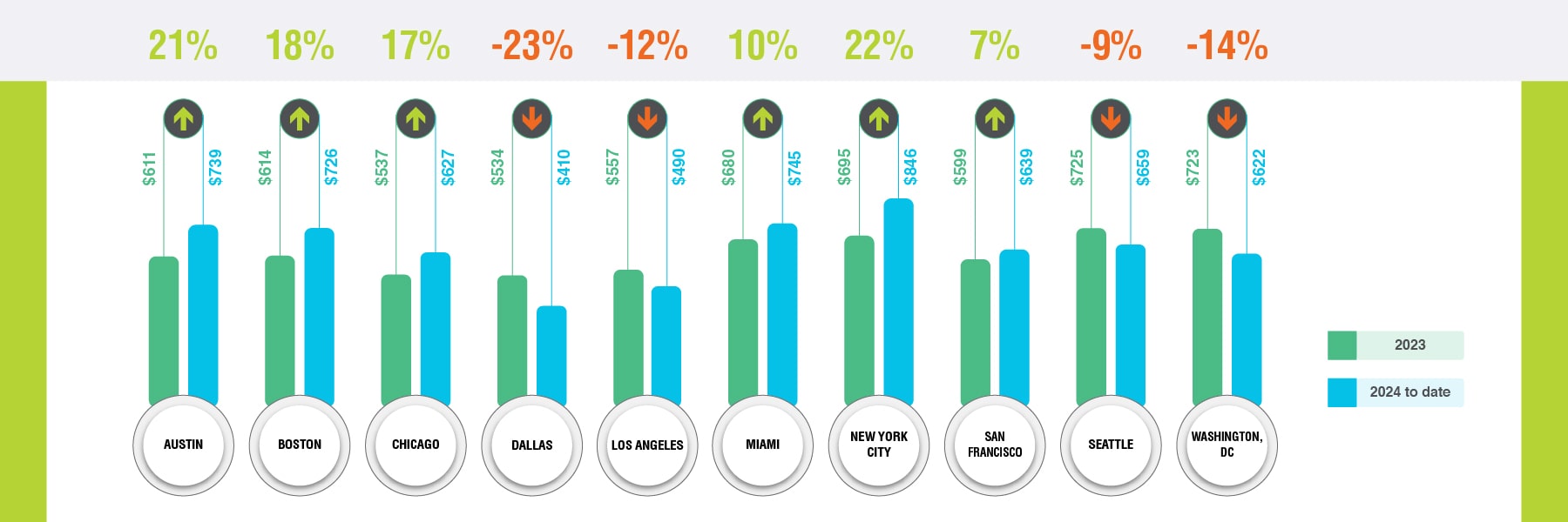 However, other markets have seen moderate growth. Miami, for example, experienced an 10% increase in average desk rates, rising from $680 in 2023 to $745 in 2024. New York City stands out with a significant 22% growth in desk rates, reaching $846 in 2024 compared to $695 in 2023. This demonstrates the diversity of market dynamics in different regions.