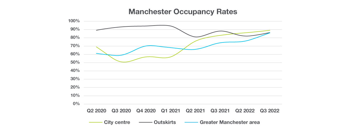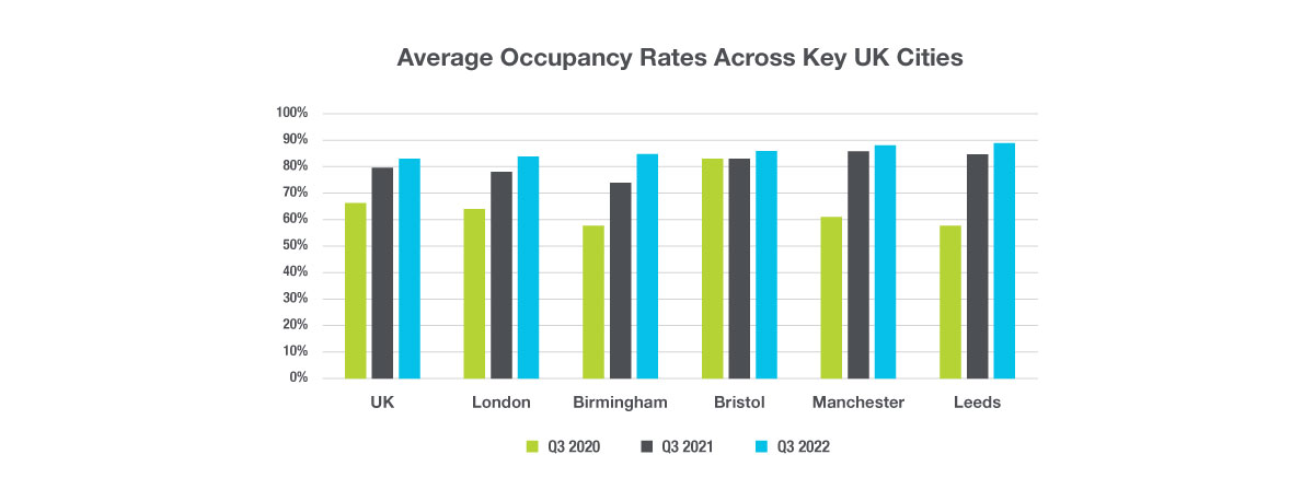 - Occupancy rates in regional cities are above the UK average, with Leeds (89%) and Manchester (88%) seeing the highest rates