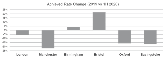 However in markets such as Bristol, where demand remained more stable, Instant have seen rate increases upwards of 22%. With a higher occupancy rate than the UK average, it’s likely that providers in the city are less inclined to discount. Other markets which are experiencing higher rates compared to this time last year include Edinburgh (13%), Leeds (25%) and Reading (14%).