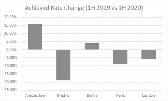 Across Europe the same trend can be seen with rates in markets such as Berlin, and Paris, both highly desirable cities and growing flexible workspace markets, staying relatively stable during the crisis. By contrast, in markets where restrictions did not appear to be as strict such as Amsterdam, demand for flexible space remained strong and rates were seen to increase. Markets hardest hit, such as Spain, saw major declines by comparison as demand dropped away almost overnight.