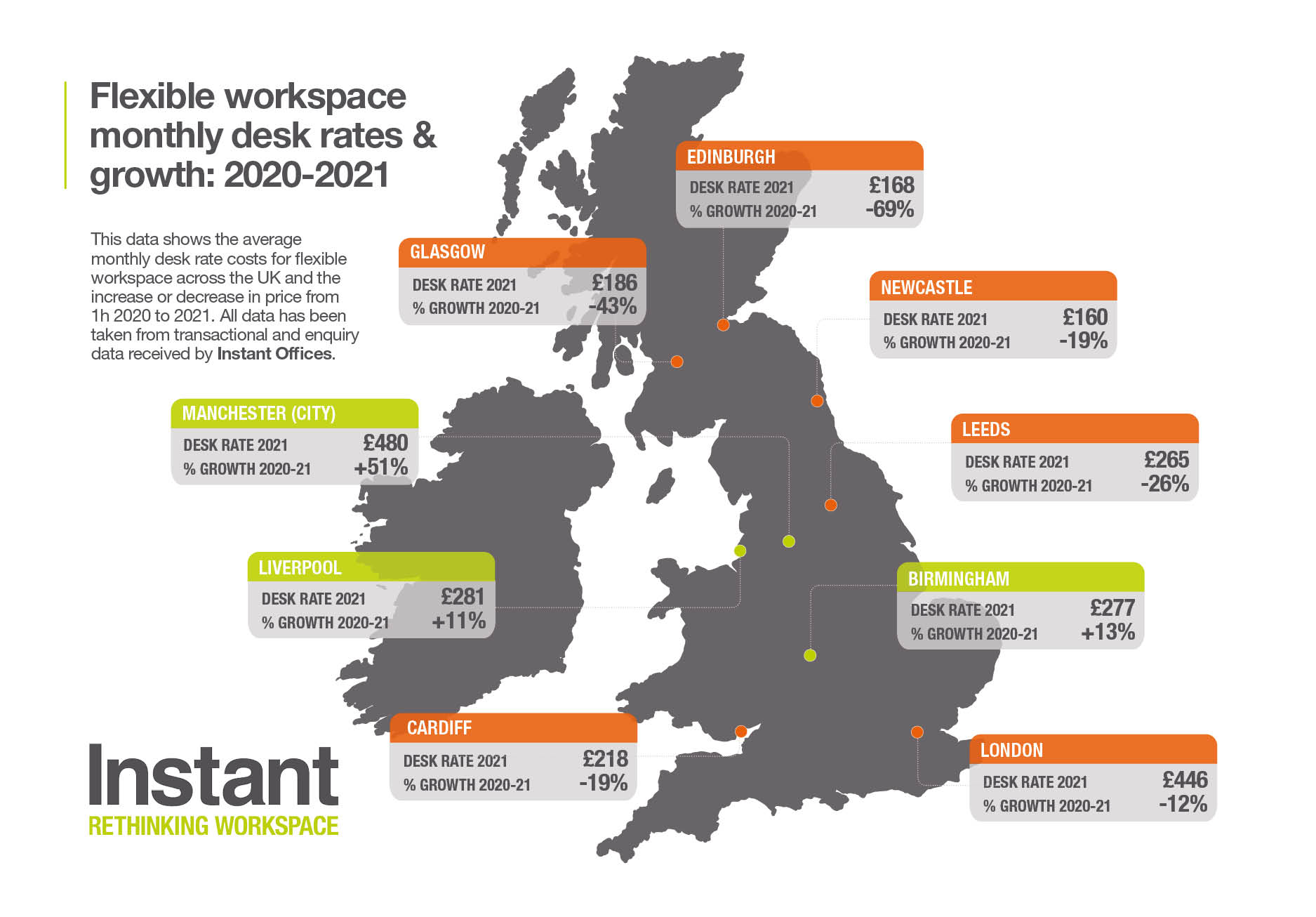 Our research also found that six out of nine major UK cities are seeing lower workstation rates for space than they were a year ago with Birmingham, Liverpool, and Manchester being the only cities to experience increased rates.