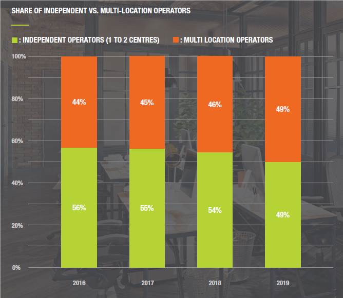 There are now 3,094 providers of flexible space within the UK, up from the 2,800 recorded in our last 2018 report. The variety of space available is overwhelming. During 2019 we have seen the rapid expansion of multi-location providers across the UK market. This figure represents 10.5% growth, a figure slightly below the overall centre supply growth figure.