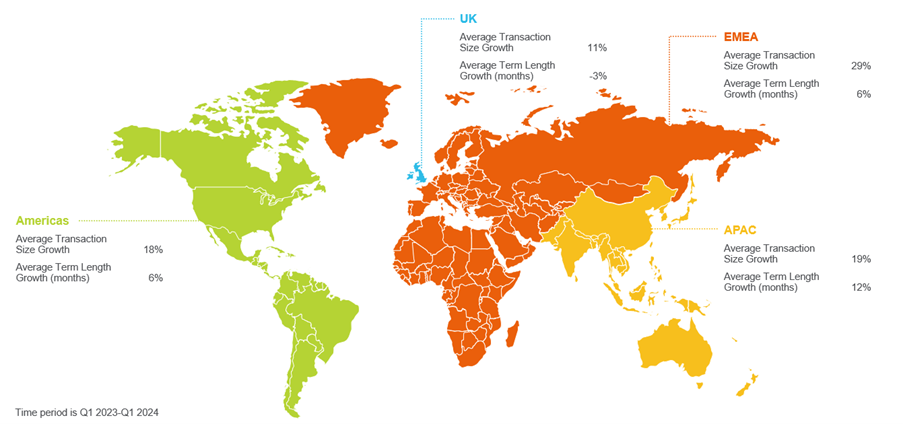 In the flexible workspace sector, transaction sizes are on the rise, increasing by 17% globally from Q1 2023 to Q1 2024, accompanied by a 4% increase in contract lengths over the same period.*