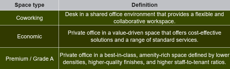 There's not one-size-fits-all for flex. Beyond the range of products and services people want from flex, there are also a range of characteristics that define them. Below is an overview of how we define the variety of spaces we track.