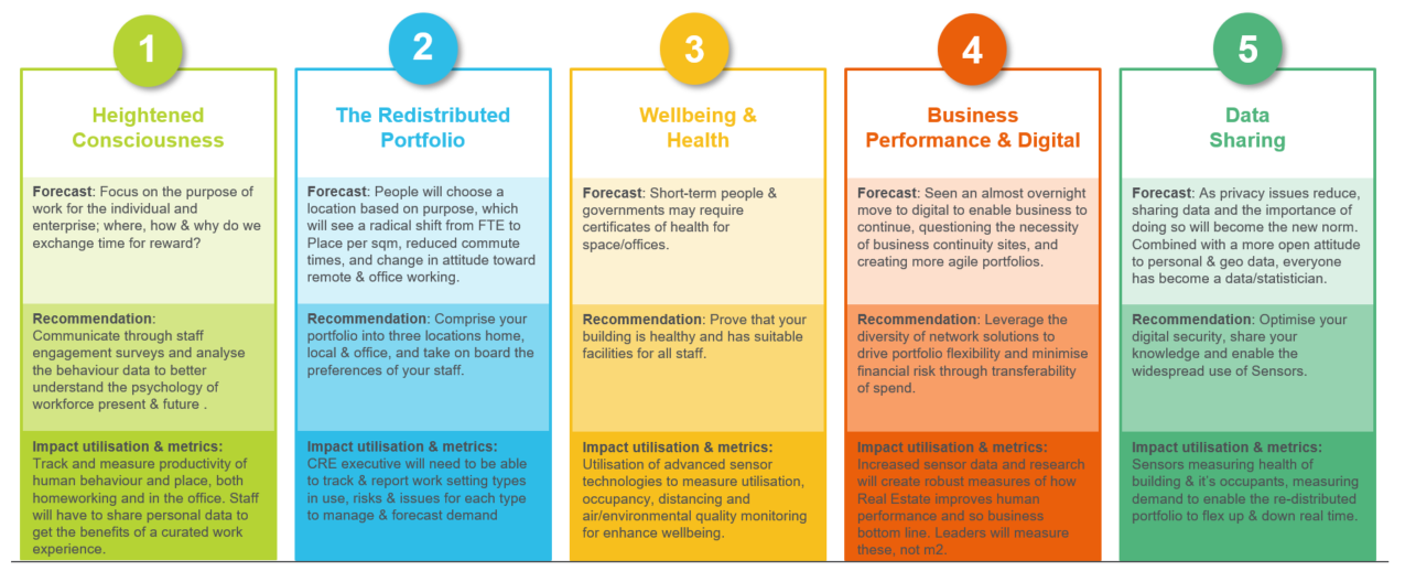 The key outcomes of this approach will be a move towards diversity of location and tenure, short to medium-term reduction in portfolio cost and, ultimately, new ways of tracking workspace performance and measurements of success. Many of these changes were already underway but will accelerate under the auspices of the lockdown and structural ramifications of the virus for the office market.