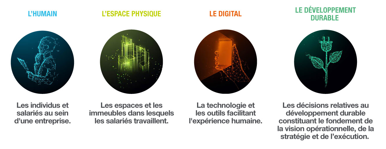 Nous avons été témoins d'une crise mondiale sans précédent qui a entraîné un changement fondamental dans notre façon de travailler. Le futur du travail hybride est devant nous, et les conditions sont réunies pour l’émergence d’un nouveau modèle hybride intégrant les quatre composantes des espaces de travail : l’Humain, l’espace Physique, le Digital et le développement Durable.